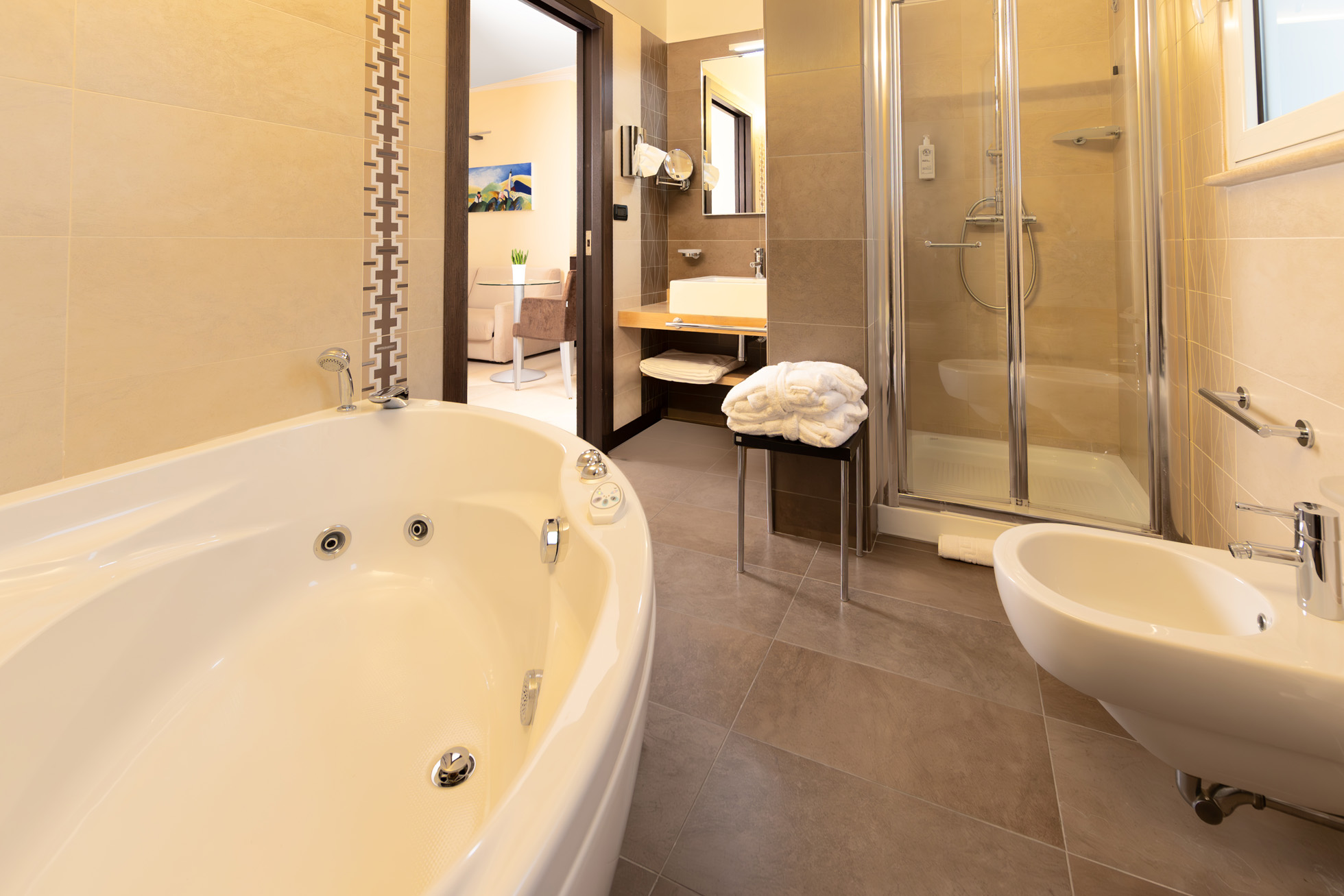 Zusätzlich zu den Annehmlichkeiten des Superior-Zimmers bieten die Suiten ein großes Badezimmer mit Whirlpool und separater Dusche, einen praktischen begehbaren Kleiderschrank und zwei Balkone mit Meerblick.
